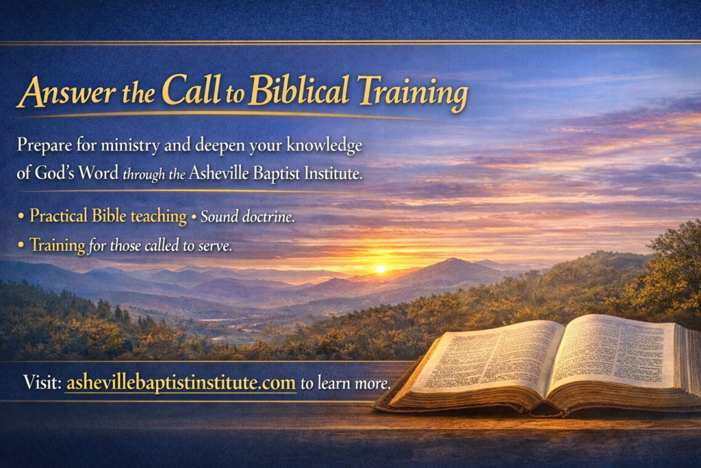 Our mission is simple: to equip believers with a deeper understanding of Scripture and sound doctrine so they can serve Christ effectively in their churches, homes, and ministries. At Asheville Baptist Institute, students receive practical, Bible-centered training designed to strengthen faith, sharpen biblical knowledge, and prepare for real ministry opportunities. Whether you desire to preach, teach, disciple others, or simply grow in your understanding of God’s Word, ABI provides a strong foundation grounded in faithful biblical teaching. If you are ready to take the next step in your study and ministry preparation, we invite you to join us and begin your journey of biblical training. Learn more and get started today at ashevillebaptistinstitute.com.